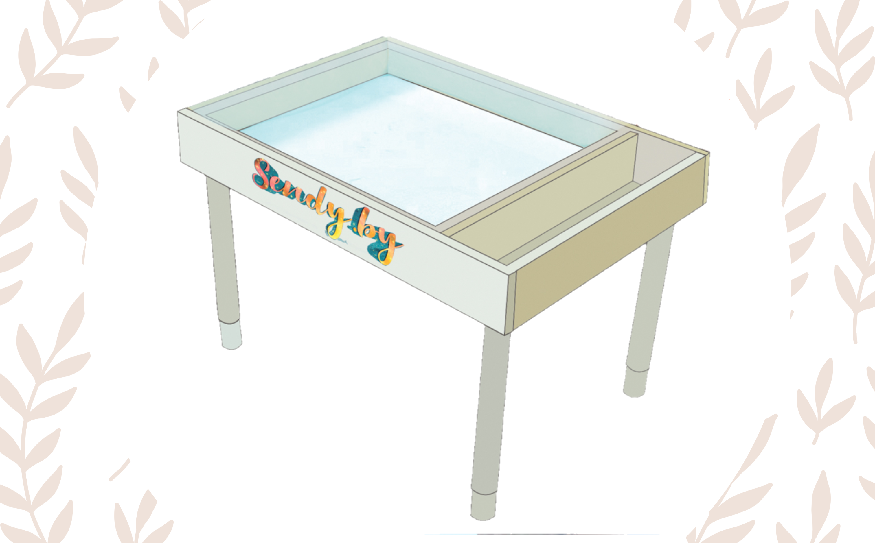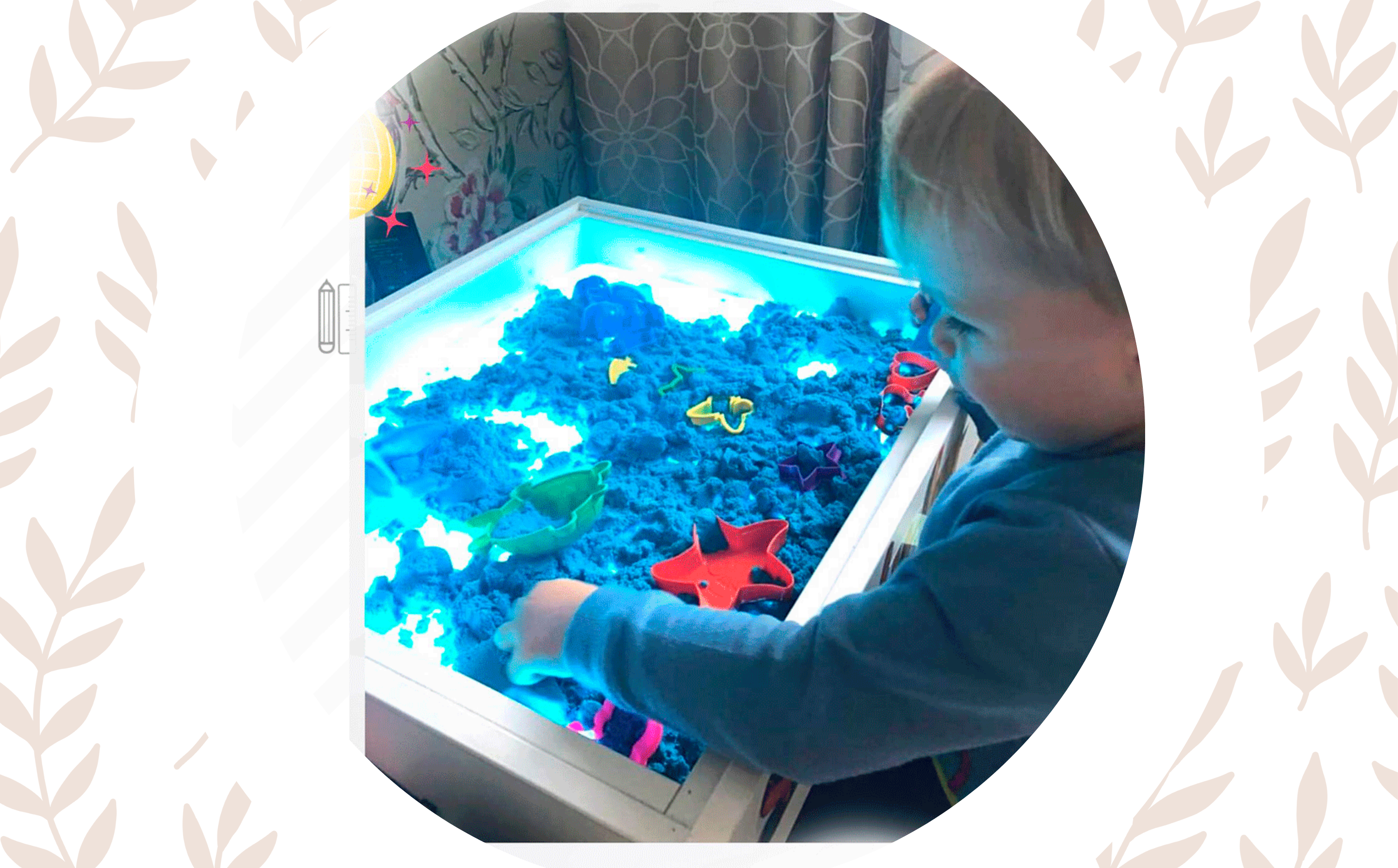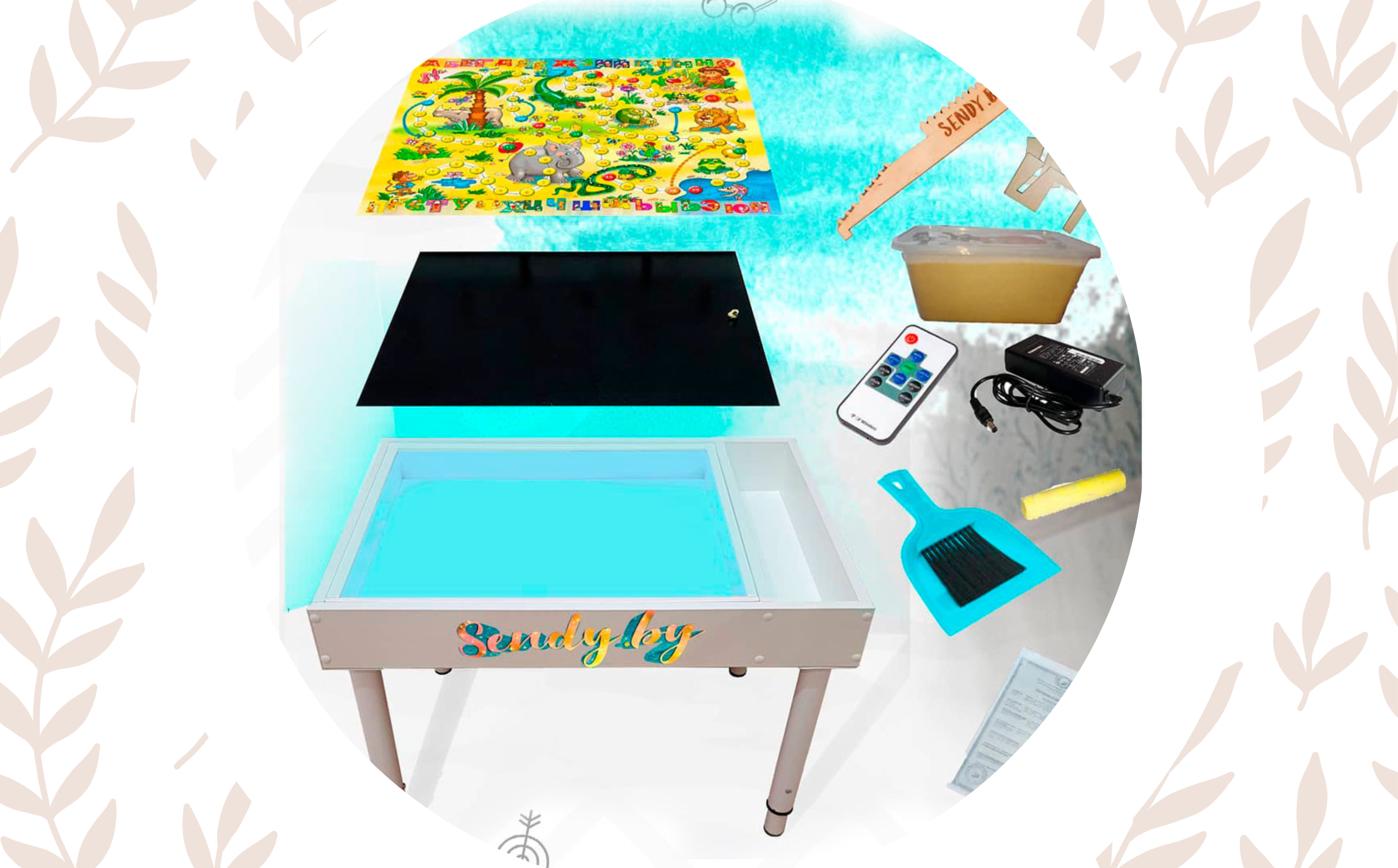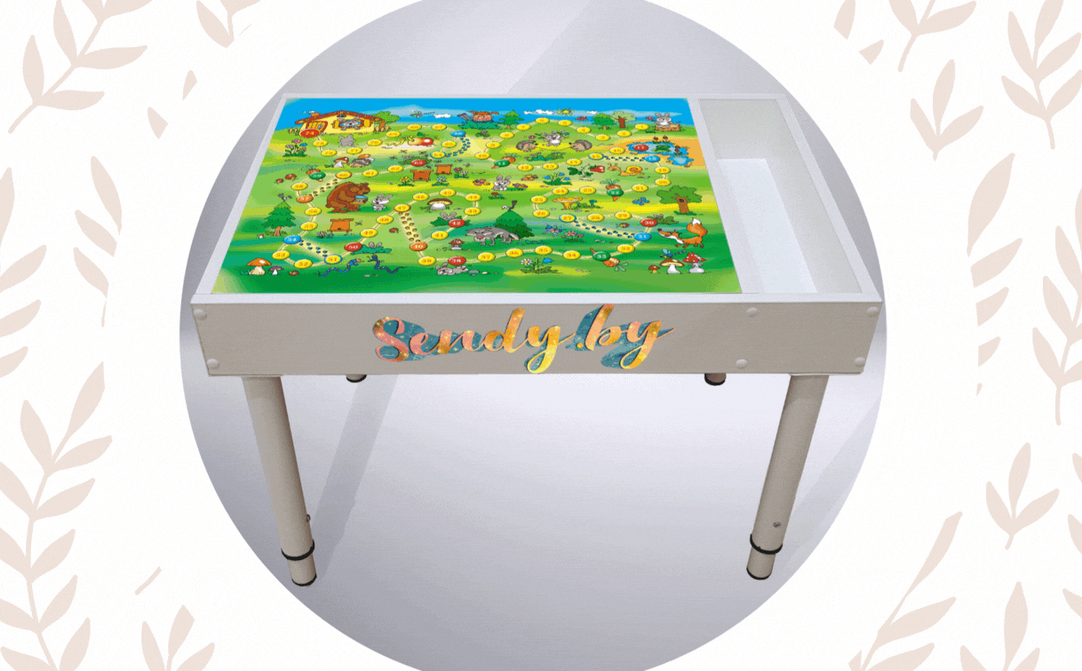 Размер у светового столика 50*70 см с глубиной игрового отсека 6 см, комплектуется телескопическими растущими ножками, двусторонней крышкой, в подарок к столику вы получите всё необходимое для того, чтобы сразу приступить к игре: кварцевый песок, щеточку для его уборки и совочек, гребешок для рисования песочком, мелок и крепления для установки крышки в качестве мольберта.