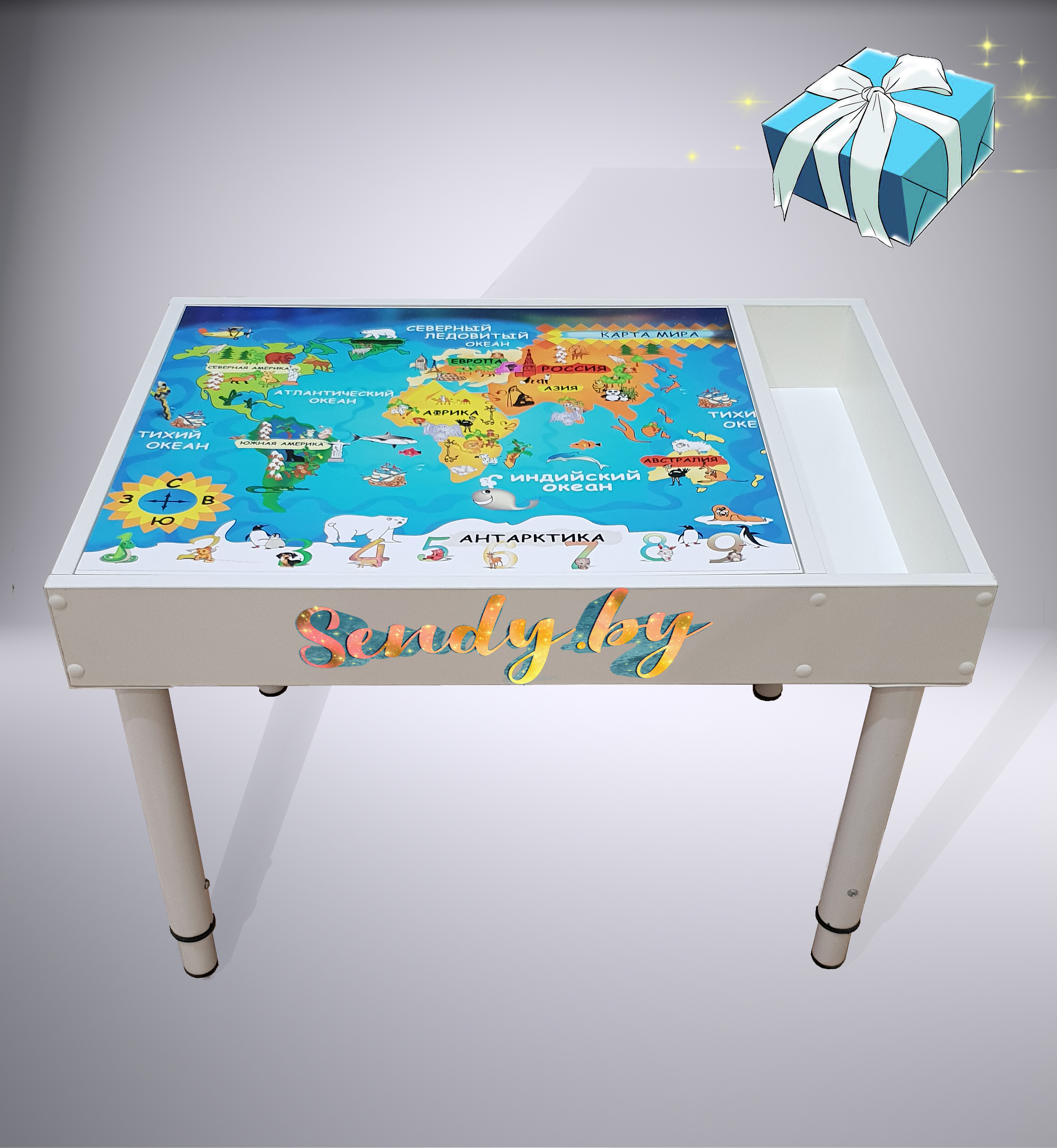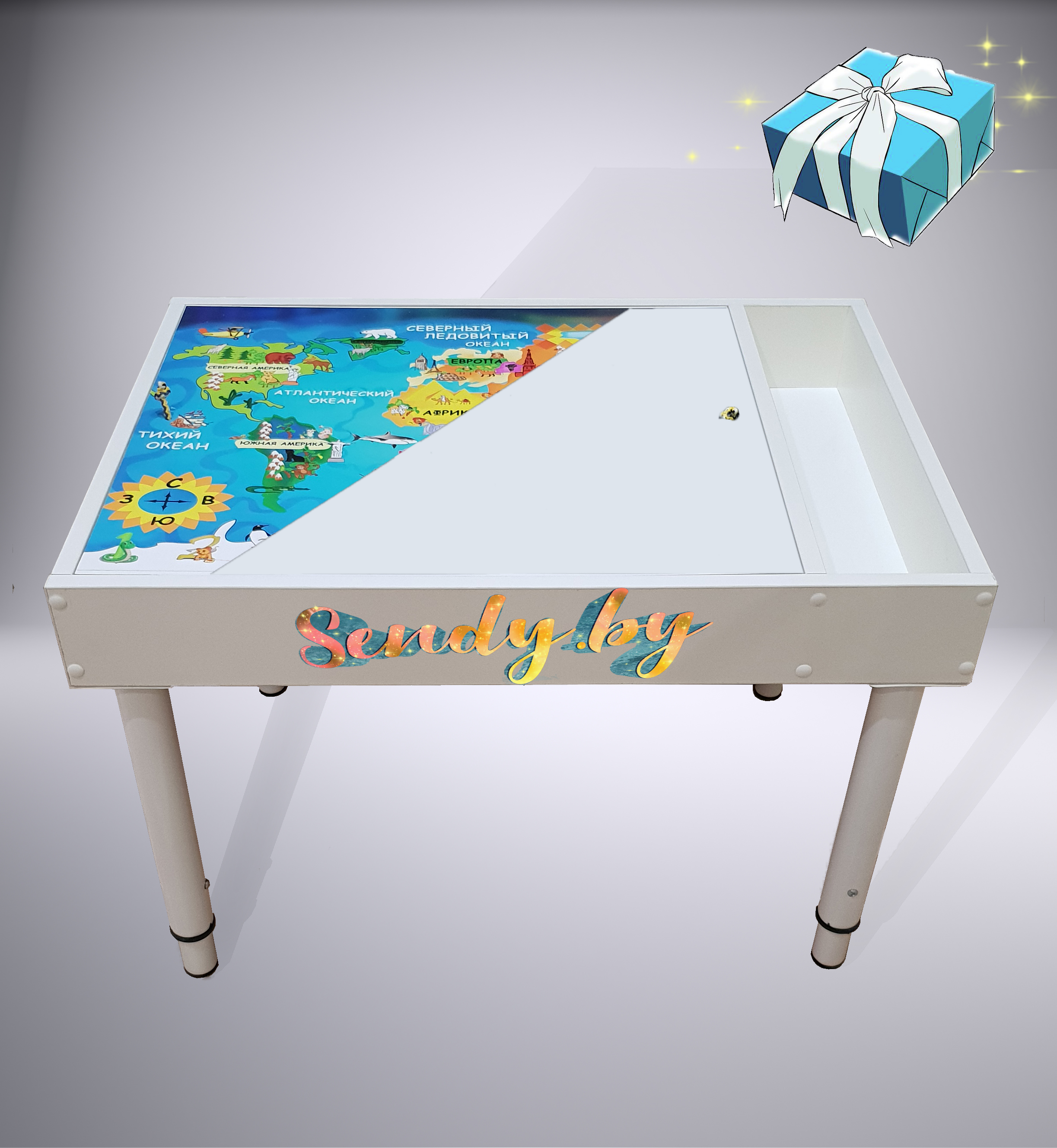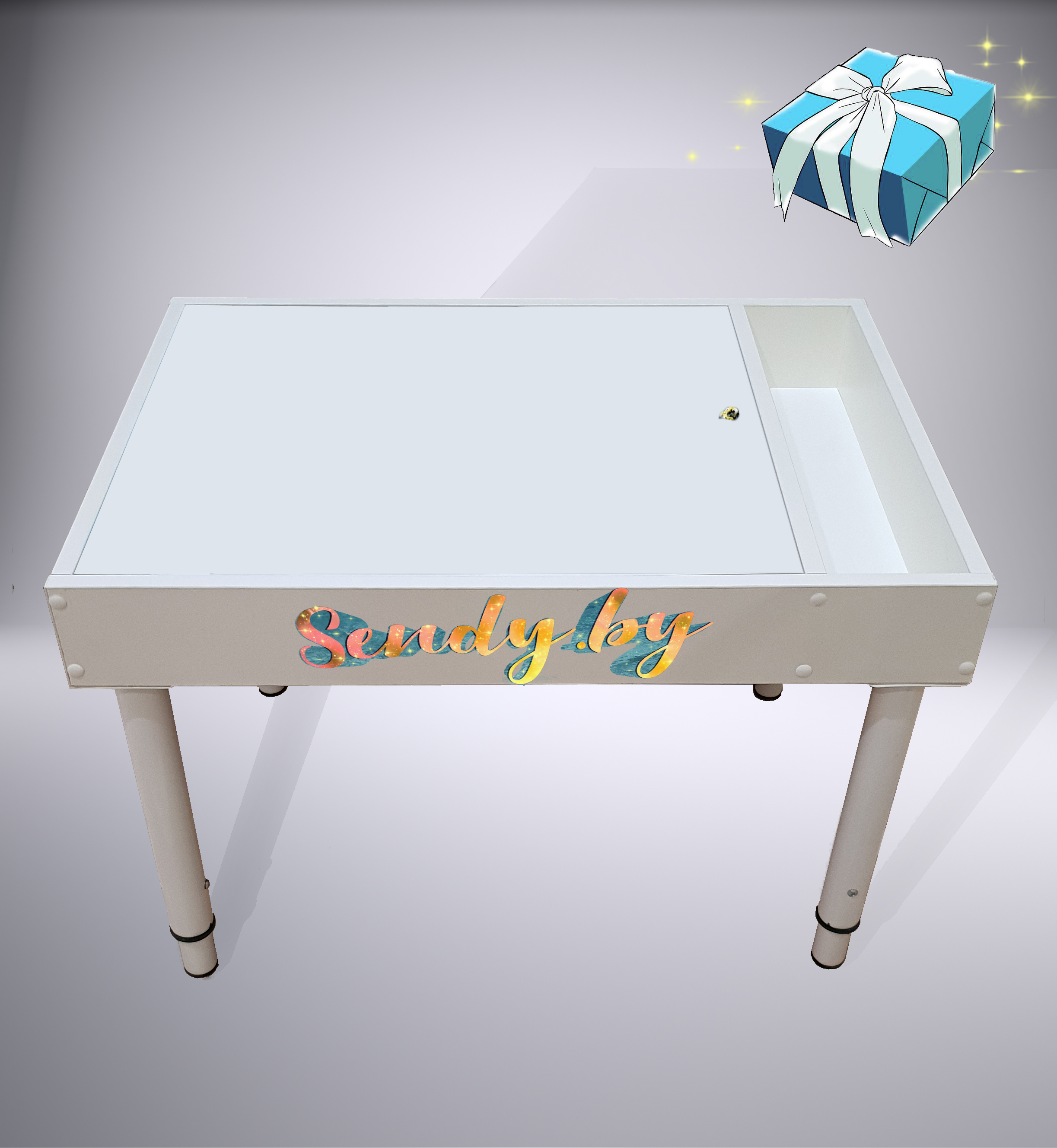 В ПОДАРОК к столику вы получите всё необходимое для того, чтобы сразу приступить к игре: КВАРЦЕВЫЙ ПЕСОК, ЩЕТОЧКУ для его уборки и САВОЧЕК, ГРЕБЕШОК для рисования песочком и крепления для установки крышки в качестве МОЛЬБЕРТА.